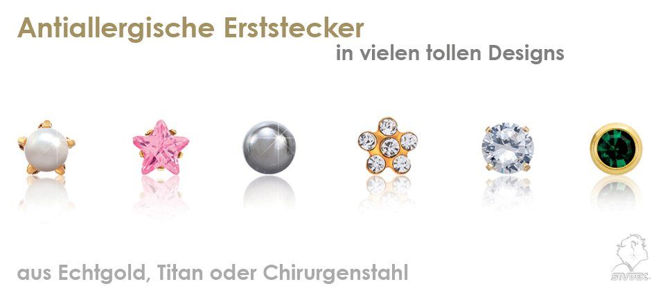 Unsere Ohrring-Kollektion für STUDEX System75 bietet eine riesige Auswahl wunderschöner Designs für Groß und Klein. Sämtliche Studex-Ohrstecker sind antiallergisch und hautfreundlich, denn Studex verarbeitet ausschließlich Chirurgenstahl, Titan und Echtgold in 18 Karat (750), 14 Karat (585) oder 9 Karat (375).
